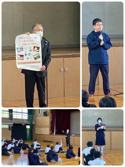 生徒指導主事の堺先生からは、「いじめにつながるような事は、小さいうちから注意します。周りの人を思いやって、お互いに尊重し合いましょう。」との話がありました。