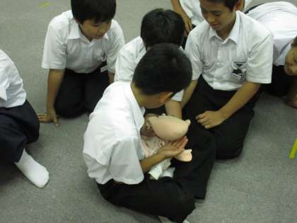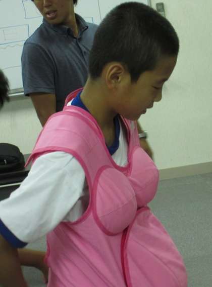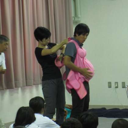 2日目には、新生児と同じ大きさのリアルな人形の抱っこや、妊婦体験装具を装着するなどの体験をしました。新生児の重さや妊婦の体の重さに驚いていました。