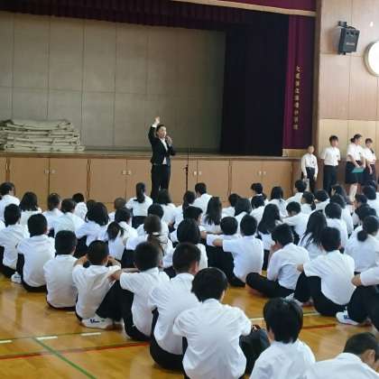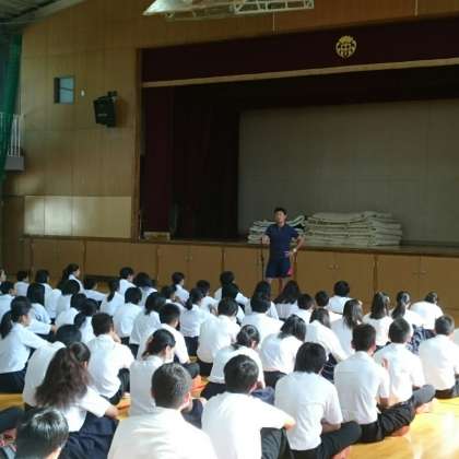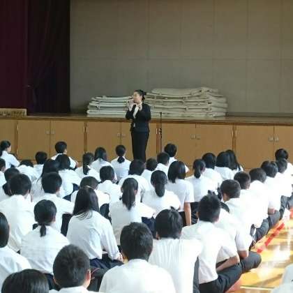 平成27年(2015年)9月14日(月)、全校集会を行いました。今日は校長先生に代わり、教頭先生がお話されました。テーマは『こころ』についてでした。始めにみんなへ矛盾を含んだ質問をされ、コンピューターはこの質問に答えられないけど、人は経験から答えが導き出せると話をされた後、心のもちようについて分かりやすく話をしてくださいました。普段教頭先生の話を聴くタイミングがない生徒のみんなにとっては、いい機会になったと思います。