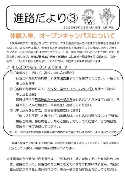 進路だより 第3号(体験入学、オープンキャンパスについて)