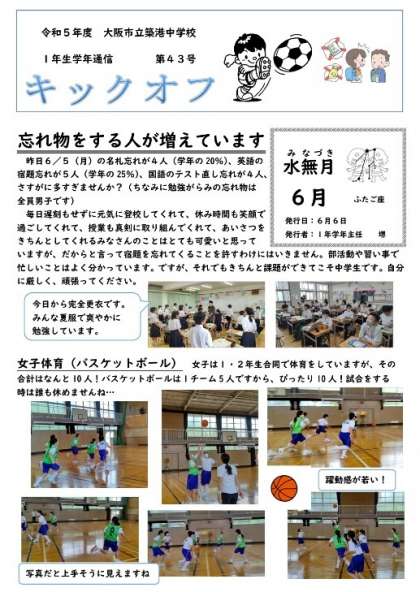 1年生学年通信 第43号(忘れ物をする人が増えています)