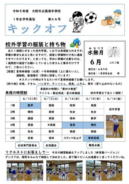 1年生学年通信 第46号(校外学習の服装と持ち物)