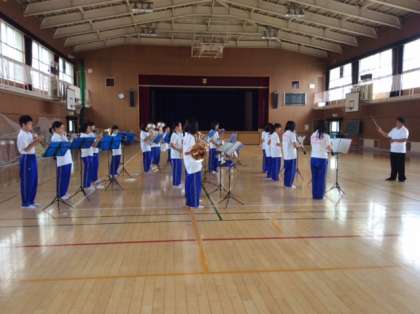 9月27日、港晴小学校の運動会です。吹奏楽部が入場行進の演奏を行います。体育館で本番前練習を終え、運動場にスタンバイしました。
