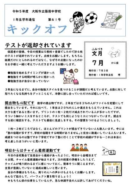 保護者の皆様、今日の授業は5教科+音楽でしたので計6枚のテストが返却されています。点検をお願いします。もちろん結果だけにとらわれるのではなく、なぜその点数になったのかをお子様と一緒に考えていただきますようお願いします。