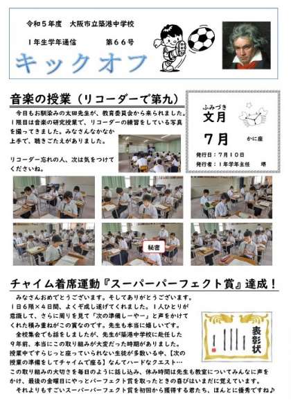 1年生学年通信 第66号(音楽の授業(リコーダーで第九))