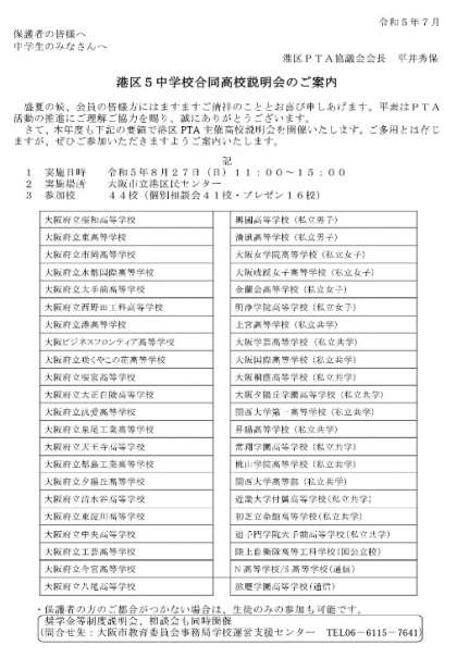港区PTA協議会から、「港区5中学校合同高校説明会のご案内」が来ています。