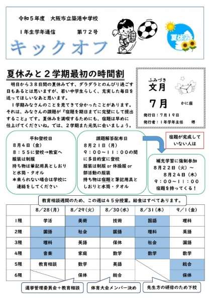 1年生学年通信 第72号(夏休みと2学期最初の時間割)