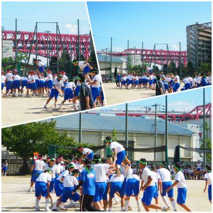 今年はハッシーと名付けられた背中渡りレースでした。結果は2組の勝利でした。その後リレー種目が続き、いよいよメイン競技、3年生による組み立て体操です。この日に向けて各クラスとも練習を続けてきました。本番は観客が息を呑む緊張した雰囲気の中、勢い衰えず見事最後まで技を披露することが出来ました。今日のこの演技ですべてが報われるようでした。