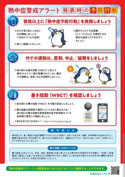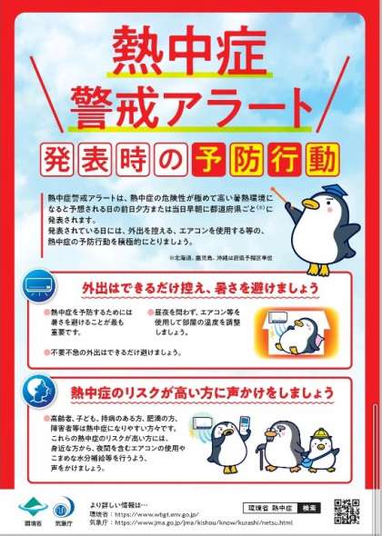 発表されている日には、外出を控える、エアコンを使用する等の、熱中症の予防行動を積極的にとりましょう。