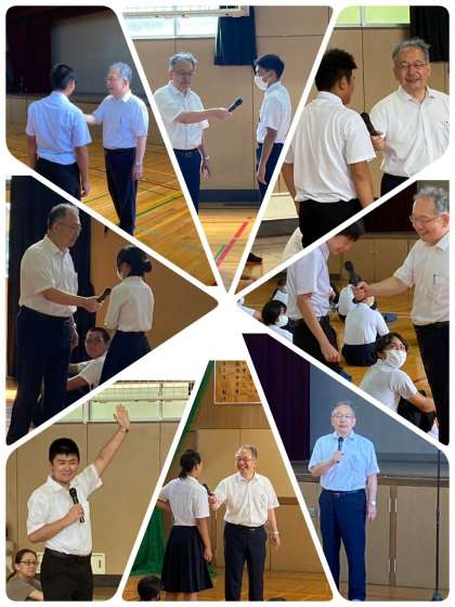 校長先生の講話の中で、各学年から夏休み中の思い出や頑張った事などについてインタビュー形式で発表してもらいました。