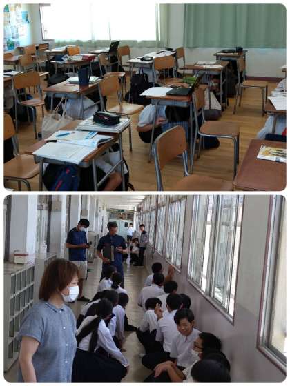 13時33分、大津波警報発令の想定で、4階に避難です。1年生はそのまま教室待機、2年生と3年生は4階廊下に避難しました。
