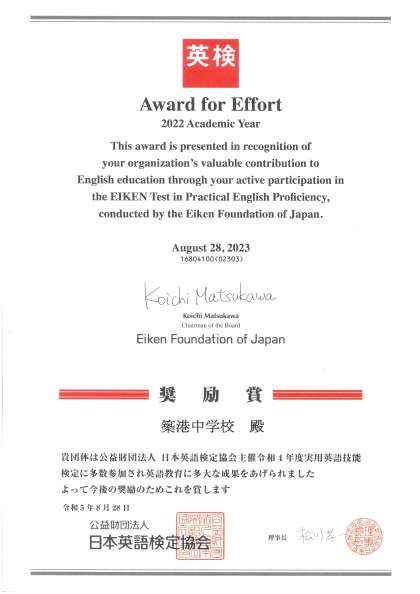 日本英語検定協会から、令和4年度に実用英語技能検定に多数参加したということで、本校が奨励賞をいただきました。