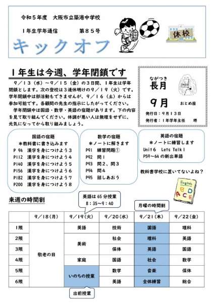 9/13(水)〜9/15(金)の3日間、1年生は学年閉鎖とします。次の登校は3連休明けの9/19(火)です。学年閉鎖中は部活動もできませんが、9/16(土)からは参加可能です。各顧問の先生の指示にしたがってください。