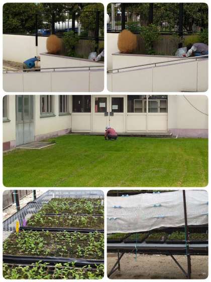 地域の方が、学校の正門付近の花壇に、新しい花苗を植える準備をしてくれています。また、校庭の芝生の手入れもしていただいています。花苗は、種から育てて、用意しています。
