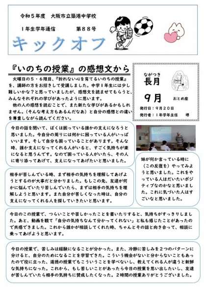 1年生学年通信 第88号(『いのちの授業』の感想文から)