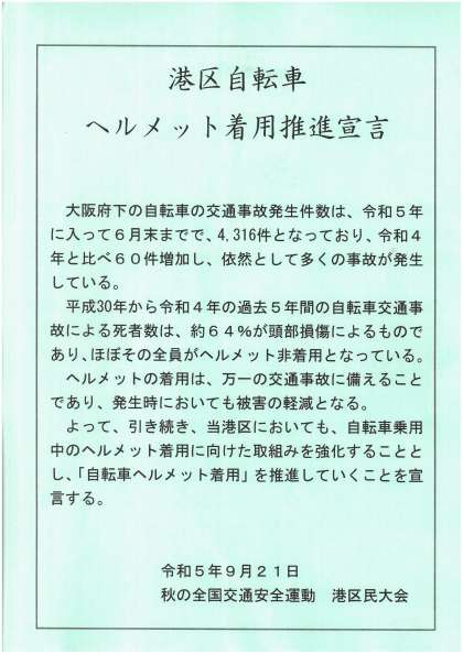 9月21日(木)〜30日(土)は、秋の全国交通安全運動です。港区の区民大会では、自転車ヘルメット着用推進宣言が採択されました。