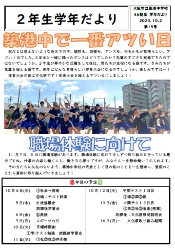 2年生学年だより15(10.2) 第15号(築港中で一番アツい日)