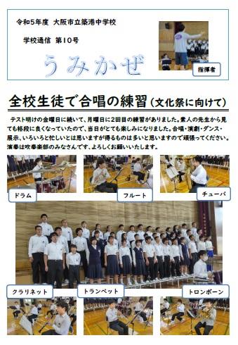 学校通信うみかぜ第10号(全校生徒で合唱の練習 文化祭に向けて)
