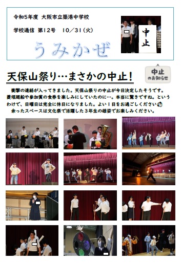 学校通信うみかぜ第12号(天保山祭り…まさかの中止!)