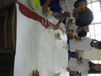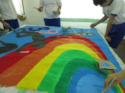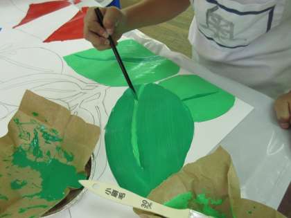 10月19日(月)から文化祭の取り組みが始まりました。1年生はまず、階段アートの制作です。美術室とAB教室に分かれて絵具を塗ります。この絵具は乾くと耐水性になるので発色もよく、階段アートには向いているのですが衣服に着くと取れません。体操服に着替えての作業になります。班ごとに協力しながら丁寧に塗っていました。すでに2時間でほぼ色がいったん塗れた1組4班の山口君の班です。1組2班の奥君は葉っぱのグラデーションを工夫しています。2組の若林君の班も協力していました。