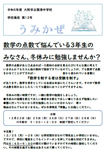 日程 : 12月22日(金)25日(月)26日(火)27日(水)28日(木)の午前中 9:00〜12:00 制服で登校してください