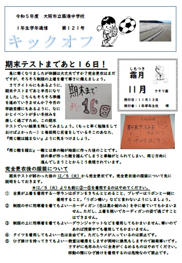 急に寒くなりましたが体調は大丈夫ですか?完全更衣はまだですが、そろそろ制服の上着を着て寒さに備えましょう。