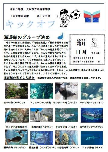 昨日の6限目に木曜日の『海遊館実習』で館内を見学する際のグループを決めました。スムーズに決まりましたか?集団で何かを決めるときに大事なことは“みんなの意見を聞く”ことです。これはかなり難しいことで、みんなの前で大きな声で自分の意見を言える人もいれば、自分の意見すらあまり言い出せない人もいます。でもそれは決して悪いことではなく、その人の大事な個性だと思います。みんなの個性を尊重したうえで、そんな人たちの意見を拾い上げる工夫ができる集団。そんな学年を作って行ってほしいなあと願います。20人という小規模で、優しい子らが集まった君たちならきっとできると思います。よろしくお願いします。