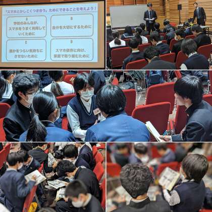 本校の生徒会が昨年度から考えていたスマホに関する課題と対策が他の中学校から高評価をもらい発表されていました。