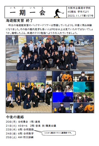 3年学年だより 45期生157号(11・17)(海遊館実習 終了)