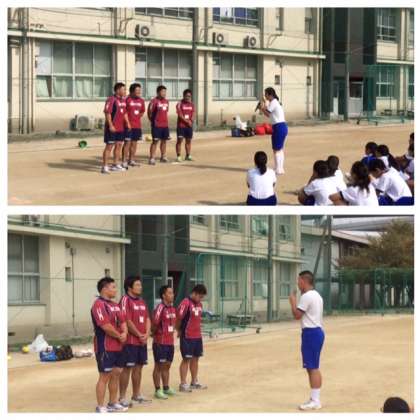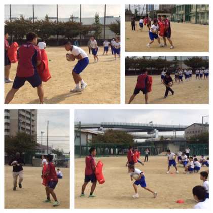 ワールドカップの熱戦の熱気冷めやまぬ中、試合前にもかかわらず、プロリーグの近鉄ライナーズからプロ選手4名がラグビーの魅力を伝えに来てくださいました。