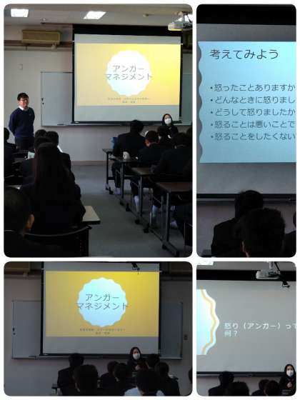 12月7日(木)4時間目は、本校のスクールカウンセラーによるアンガーマネジメント講座です。全学年の生徒が多目的室に集合して、講座を受講しています。