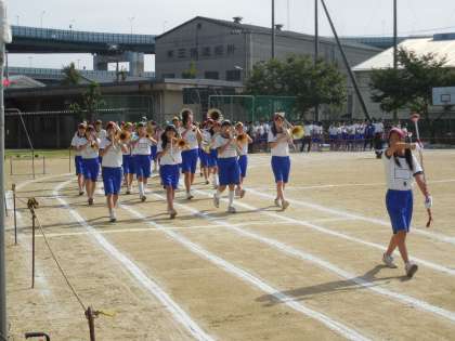 午前9時16分、吹奏楽部を先頭に入場行進です。曲は「ボギー大佐」途中で「大阪市歌」の演奏もありました。