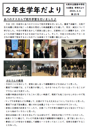 2年生 学年だより25(2・6) 第25号(あべのタスカルで校外学習を行いました♪)