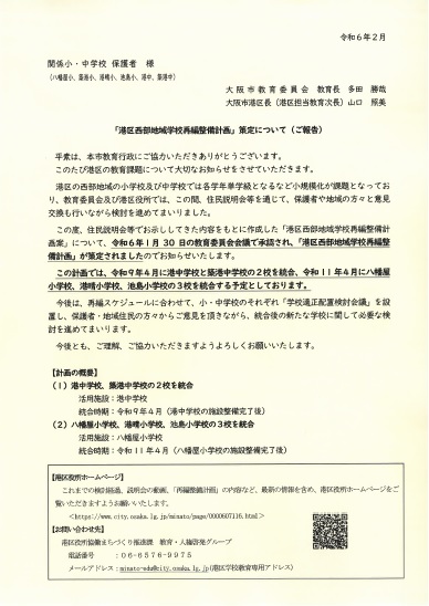 港区役所より、「港区西部地域学校再編整備計画」策定について(ご報告)が送られてきました。