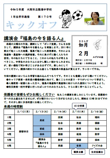 来週の火曜日の午後、講師として「ボンド亜貴」さんをお招きして、講演会『福島の今を語る人』を実施します。2011年に東北で起こった大地震、福島で起こった原発事故、それによる海産物・農産物への風評被害。それに負けずに働く人たちの苦労。今の私たちにできること、これからの私たちが考えるべきこと。中学生のみなさんには少し難しい話かもしれませんが、若い感性で何か学ぶことがあるはずです。楽しみにしていてください。講演の終わりにお土産として福島県の県産品が貰えます、ラッキーですね。