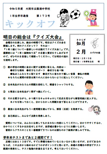 1年生学年通信 第173号(明日の総合は『クイズ大会』)