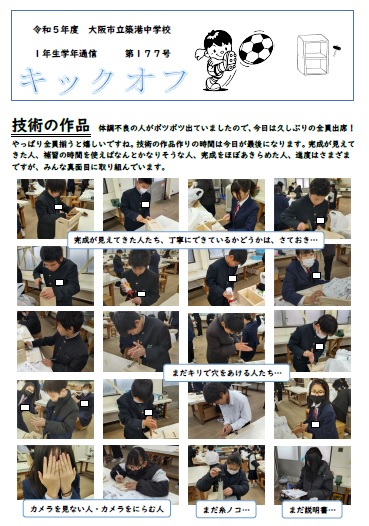 体調不良の人がポツポツ出ていましたので、今日は久しぶりの全員出席!やっぱり全員揃うと嬉しいですね。技術の作品作りの時間は今日が最後になります。完成が見えてきた人、補習の時間を使えばなんとかなりそうな人、完成をほぼあきらめた人、進度はさまざまですが、みんな真面目に取り組んでいます。