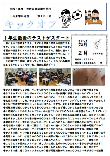 1年生学年通信 第181号(1年生最後のテストがスタート)