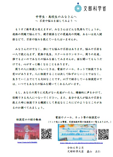 文部科学大臣メッセージ 中学生・高校生のみなさんへ〜不安や悩みを話してみよう〜 令和6年2月