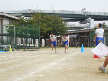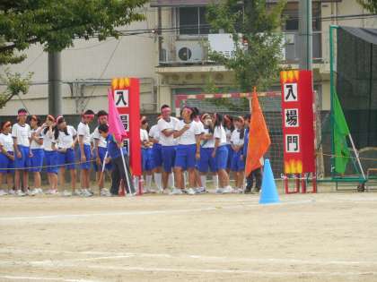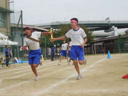 ハチマキの色は、1組−ピンク色 2組−濃オレンジ色