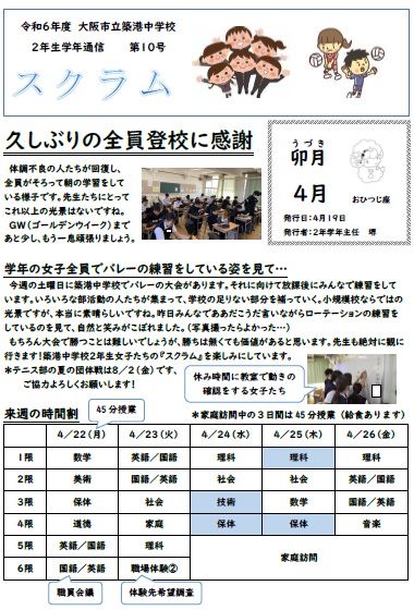 2年生学年通信スクラム第10号は、クラスの様子と部活動、来週の時間割です。