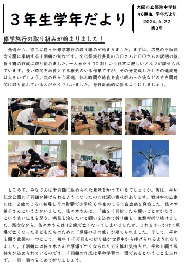 3年生学年だより第3号は、いよいよ始まりました修学旅行の取り組みと、金曜日(4月19日)の生徒会演説の様子です。