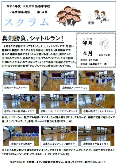 2年生学年通信スクラム第14号は、シャトルランの様子です。