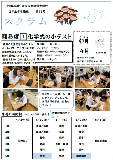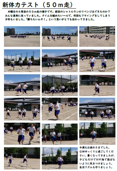 2年生学年通信スクラム第15号は理科の小テストの様子と、50メートル走です。