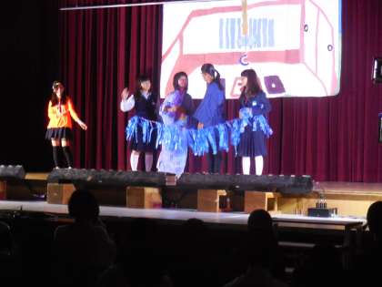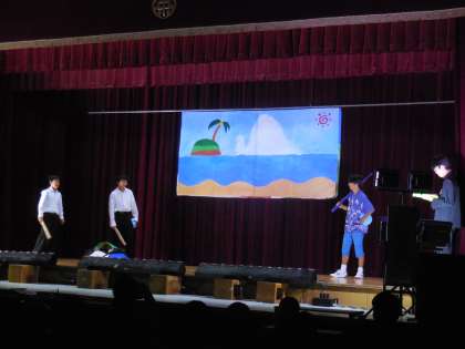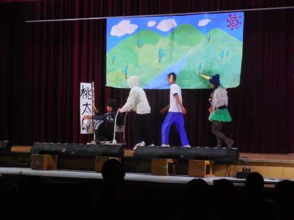 2年2組は4つの昔話をオムニバス風に仕上げた舞台です。それぞれのお話しが現代風パロディになっています。池田さんが亀の役で立候補してがんばっていました。それぞれの幕に工夫があります。