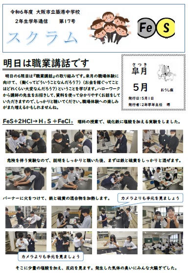 2年生学年通信スクラム第17号は、理科の実験の様子と、明日の職業講話についてです。