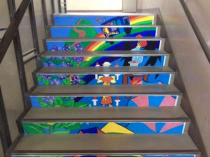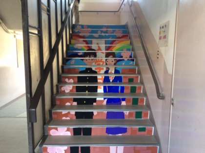 今年の1年生は展示で階段アートの取り組みました。テーマに沿って階段に班ごとに描きました。1組1班 入学式、2班 6月一泊移住と梅雨です。