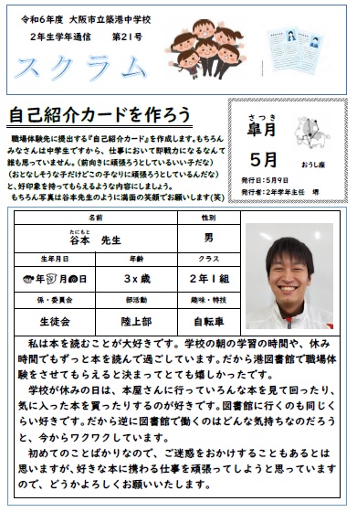 2年生学年通信スクラム第21号は、職場体験の「自己紹介カード」について、です。
