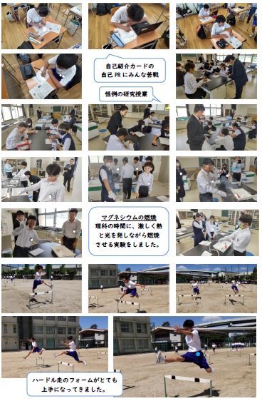 自己紹介カードを書いている様子や、きれいなフォームで跳べるようになってきたハードルの体育授業、マグネシウムの燃焼実験の理科研究授業の様子です。