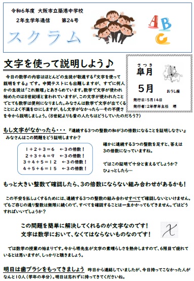 2年生学年通信スクラム第24号は、数学でつかう文字についてです。